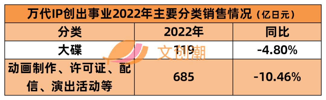 上图,是万代的IP创出事业中主要项目的年度销售情况,动画制作、许可证、配信及演出活动等销售额685亿日元,同比下降10.46%,大碟销售额119亿日元,同比下降4.8%。