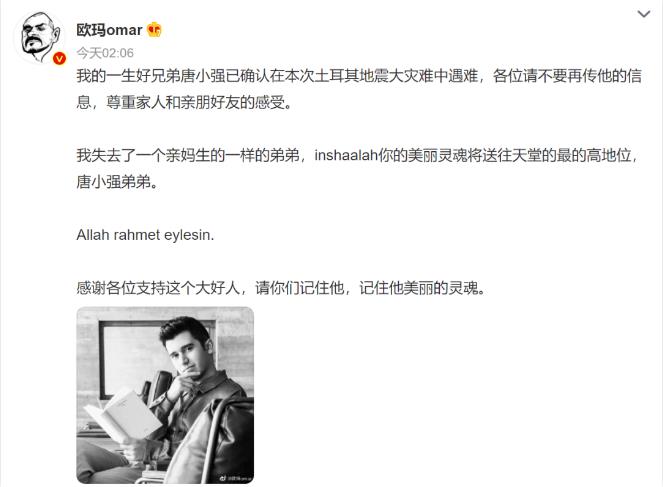 据身在土耳其的唐小强友人@欧玛omar 10日凌晨发布的最新消息称,唐小强已经确认在本次土耳其大地震中遇难。唐小强于2010年来中国留学,曾就读于厦门大学海外教育学院。2016年,他作为土耳其的代表和常驻嘉宾参与《非正式会谈》节目的录制,受到中国观众的欢迎,很多网友亲切称呼他“唐大哥”。(中国新闻网)