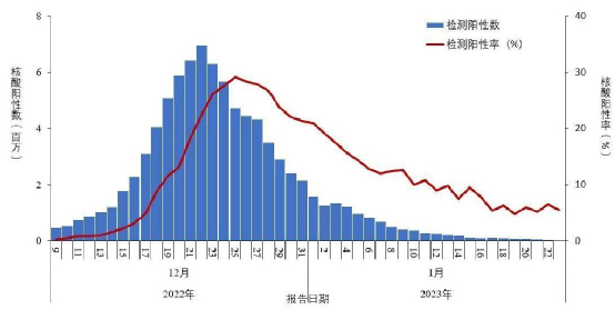 根据1月25日中国疾病预防控制中心官网发布的全国新型冠状病毒感染疫情情况,阳性人数在2022年12月22日达到高峰(694万)后逐步下降,2023年1月23日降至最低1.5万;检测阳性率12月25日(29.2%)达高峰后逐步下降,1月23日降低到5.5%。