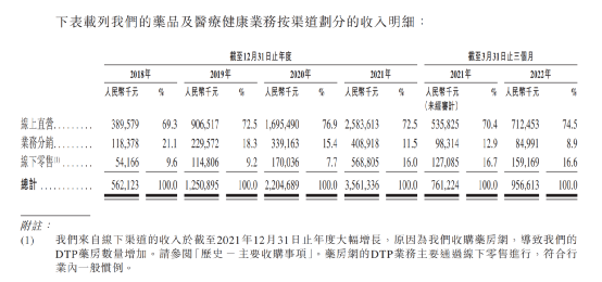 招股书显示,2022年一季度,线上直营收入约占叮当健康收入的74.5%,其线上收入又按照渠道划分为自营平台和第三方平台两种。