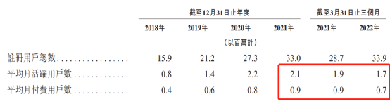2018年至2022年一季度,自营平台和第三方平台的收入持续上涨。但从自营平台运营情况看,2022年一季度平均月活跃用户数170万、平均月付费用户70万,双双同比下滑。这还是疫情期间、线上买药激增的时期。