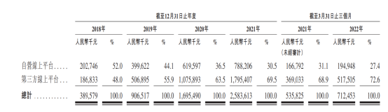 而第三方平台收入的比重,却从2018年的48%涨至2022年一季度的72.6%。