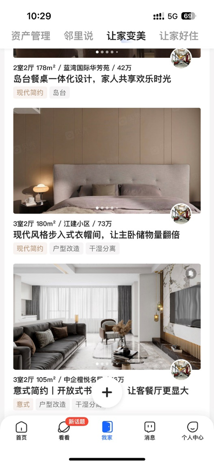 今年1月中旬,贝壳App全新升级改版,新的首页底部导航栏增加了“我家”频道,里面集合了房产买卖租赁和家装家居等功能。在上线“我家”的城市,用户可预约维修等家庭服务、做专属户型分析并获取装修方案等服务。