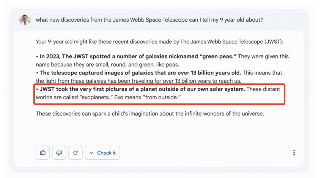 Bard的简单Demo演示中,还被发现了1项事实性错误。