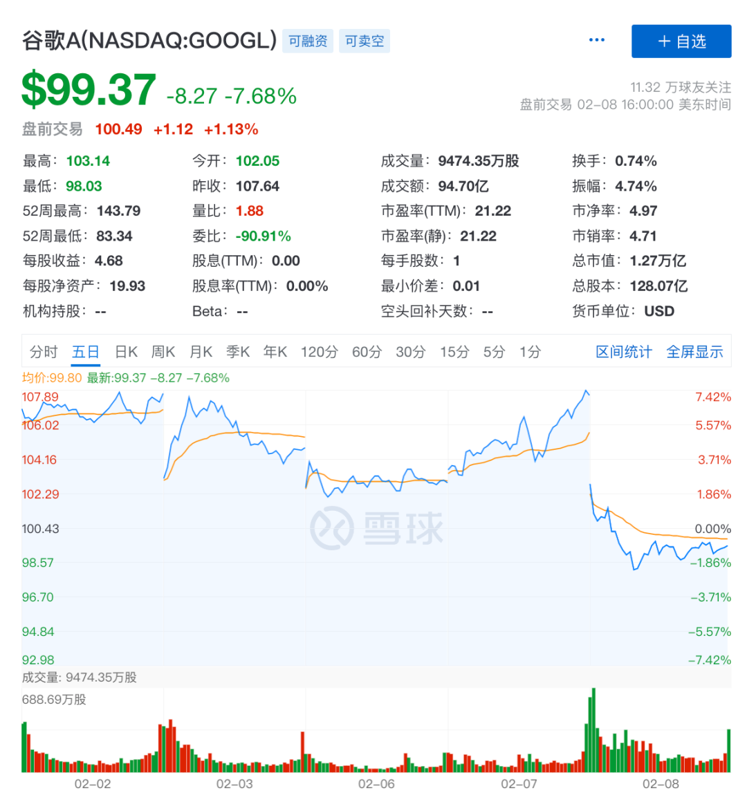 直播一结束,谷歌股价直线下降,一夜大跌逾7%,市值蒸发约1056亿美元,约7172.78亿元人民币。