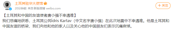 使馆表示:我们悲痛地获悉,土耳其公民İdris Kartav(中文名唐小强)在此次地震中不幸遇难。他是土耳其和中国友谊的桥梁,我们向他和他的家人以及关心他的中国朋友们表示沉痛哀悼。