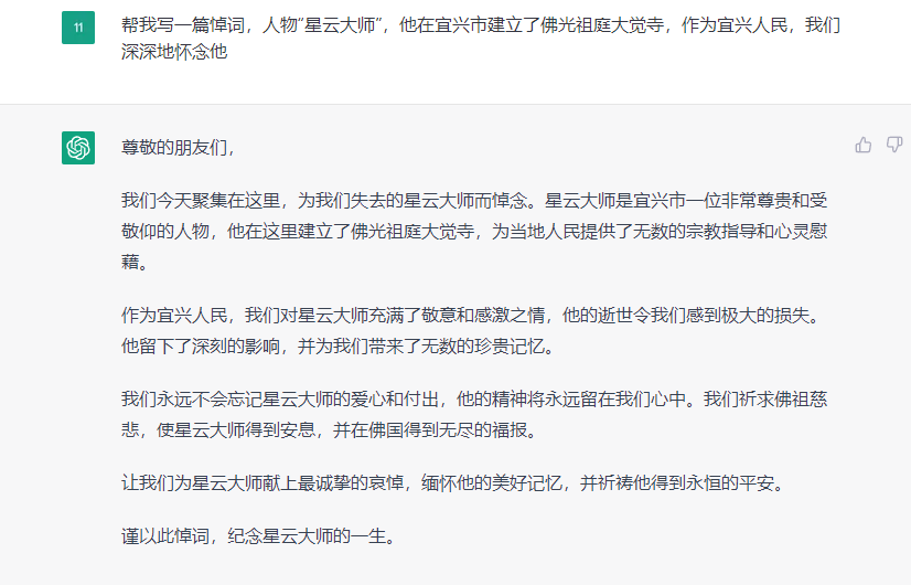 网上都说,ChatGPT最有可能替代的,就是我们这种写公文的文员。所以,当我知道它的存在之后,我也想看看,它能不能帮我在工作中偷个懒。但我的总体感受是,效果远远达不到我的预期,让我有点失望。那天,正好有一个新闻是星云大师去世了,我就让它写一篇悼文,但我发现,ChatGPT甚至不认识他,更不要说能用一些佛教用语来写纪念文章了。