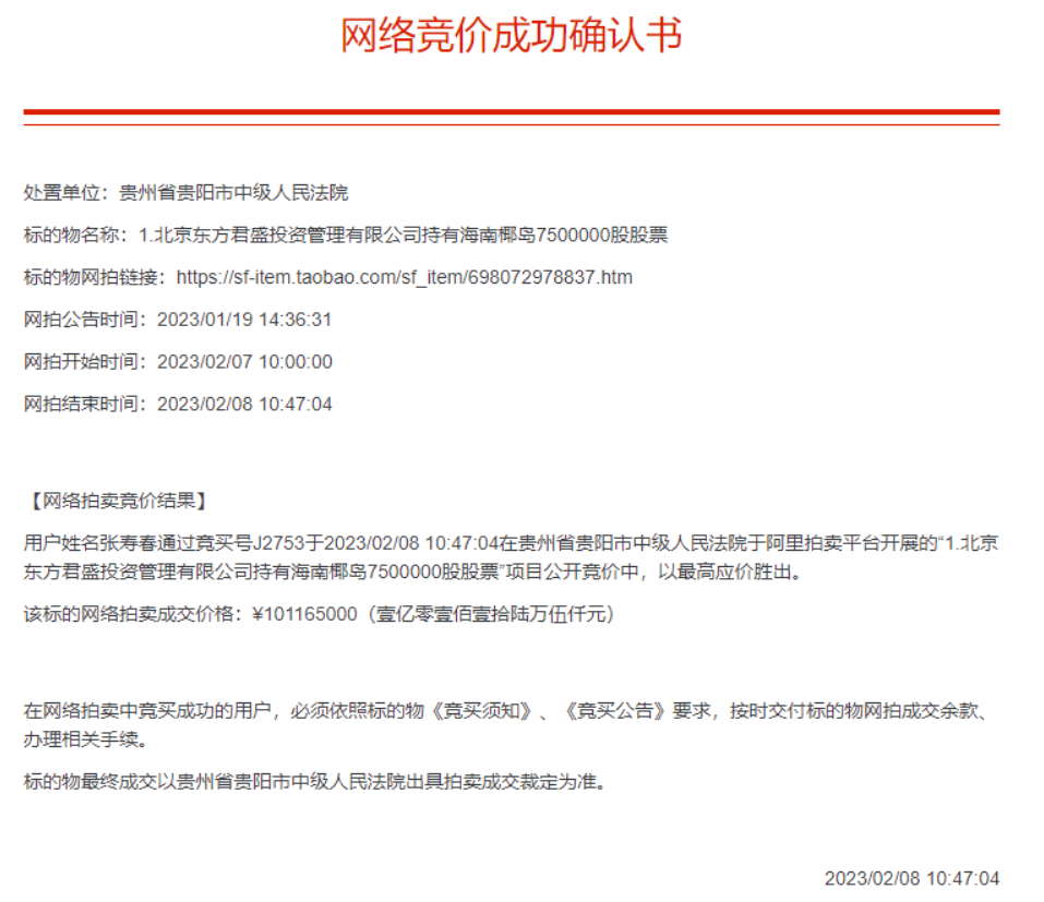2月9日海南椰岛公告称,在网络公开渠道获悉,公司股权拍卖一事在淘宝司法拍卖网网拍结束。根据淘宝司法拍卖网公示的网络《竞价成交确认书》,张寿春以1.01亿元的价格竞得海南椰岛750万股股票,占公司总股本的1.67%。