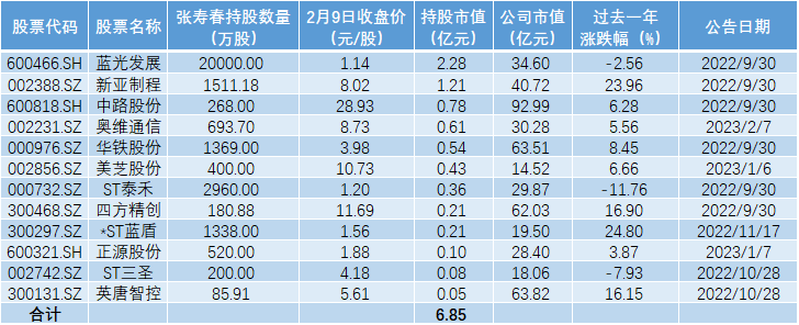 以2月9日收盘价计算,张寿春对两家上市公司持股市值过亿,分别为:持有蓝光发展(600456.SH)2.00亿股,持股市值约为2.28亿元;持有新亚制程(002388.SZ)1511.18万股,持股市值为1.21亿元。