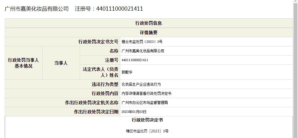 据广州市监局公布的行政处罚决定书显示,2022年10月18日,执法人员发现广州市嘉美化妆品有限公司(下称“广州嘉美”)生产未经注册的特殊化妆品,随即对相关产品实施扣押,并对广州嘉美立案调查。