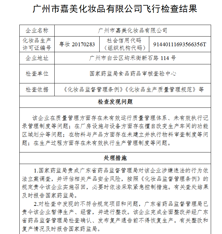 与此同时,在隶属于国家药监局的中国健康传媒集团舆情监测中心发布化妆品企业风险预警提示中,广州嘉美的风险等级也显示为“重点关注企业”,风险原因即为“飞检不合格”。