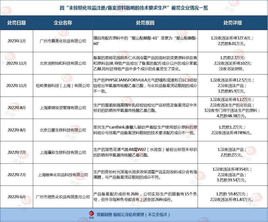 根据《化妆品监督管理条例》第二十九条第二款规定,“化妆品注册人、备案人、受托生产企业应当按照化妆品注册或者备案资料载明的技术要求生产化妆品”。经青眼不完全统计,自2022年6月至今已有8家企业因违反这一规定而被处罚。
