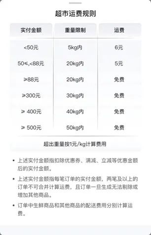 此外,不同于自建物流的京东与天猫超市,抖音超市的商品为固定顺丰发货,下午 16:00 前下单支持次日达。运费价格上也有一定限制,在不超过重量限制情况下, 50 元以下 6 元,50 至 88 元运费 5 元,88 元以上免运费。