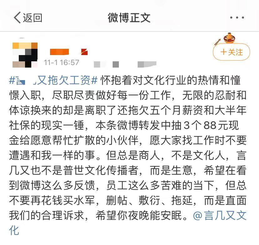 门店方面的收缩只是企业困境的缩影。2021年下半年起,言几又欠薪、拖欠供应商货款事件开始发酵。2021年底,央视财经播出《网红书店困局》节目,报道了言几又欠薪、不给员工交社保、多家门店关闭等情况,向公众展示了言几又所面临的艰难处境。