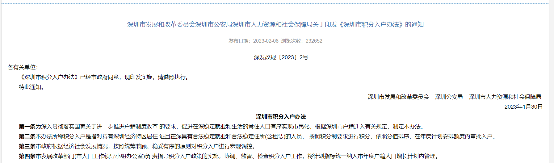 2月8日,深圳市发展和改革委员会、深圳市公安局、深圳市人力资源和社会保障局联合发布关于《深圳市积分入户办法》(以下简称“办法”)的通知。