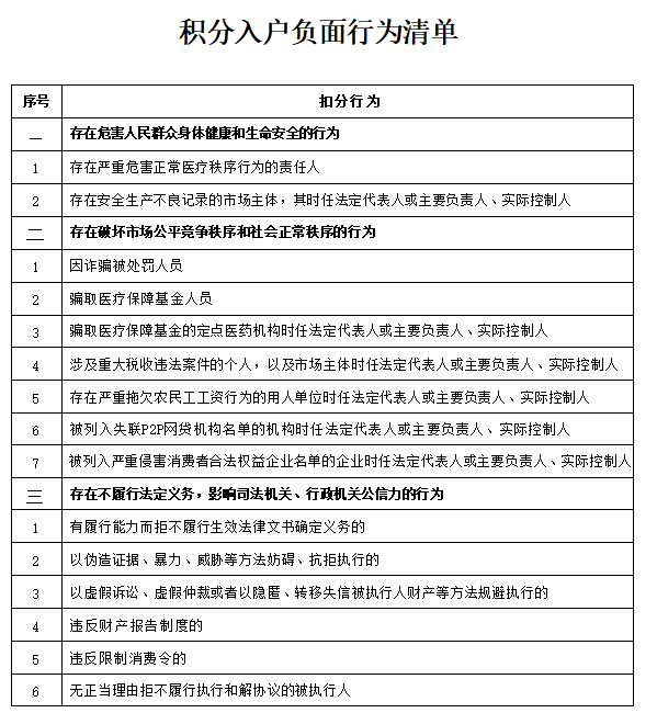 负面行为指标方面,制定负面行为清单,列明存在危害人民群众身体健康和生命安全的严重行为、存在破坏市场公平竞争秩序的严重行为、存在拒不履行法定义务严重行为等3大类15项负面行为。如有清单中任一行为的,一次性扣200分。