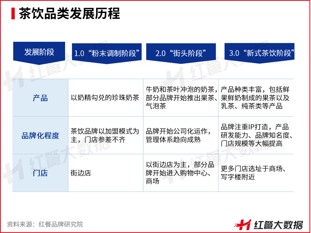 总体来看,我国现制茶饮品类已经发展相对成熟,主要经历了三个发展阶段,分别是以珍珠奶茶为主的1.0“粉末调制阶段”,产品主打“茶叶+牛奶”的2.0“街头阶段”,以及以鲜果鲜奶为主的3.0“新式茶饮阶段”。