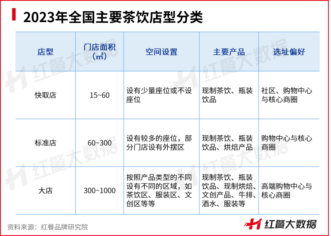 茶饮门店的店型可主要分为快取店、标准店和大店模式。目前,面积较小的快取店模式已经成为了茶饮市场的主流,在这种模式之下,品牌能够以较低的成本快速拓张。而标准店和大店则走的是重资产模式,提供多元的产品和“第三空间”的体验。喜茶和奈雪的茶都是这种模式的先行者,他们曾经均尝试过以此来开辟第二增长曲线。