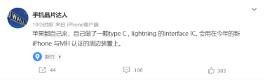 但今日,有数码博主爆料称,苹果公司已为Type- C接口自研了一颗Lightning的interface IC,将会用在今年的新iPhone与MFI认证产品中。