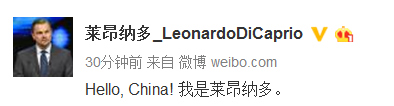 10月8日电 今日下午,奥斯卡影帝莱昂纳多开通微博,并发文:“Hello,China! 我是莱昂纳多。”向中国的粉丝问好。莱昂纳多凭借其在《泰坦尼克》中的精彩演出在全球收获了大批的粉丝,在中国也拥有极高人气。在2016年,凭借电影《荒野猎人》获得第73届金球奖最佳男主角奖和第88届奥斯卡金像奖最佳男主角奖。