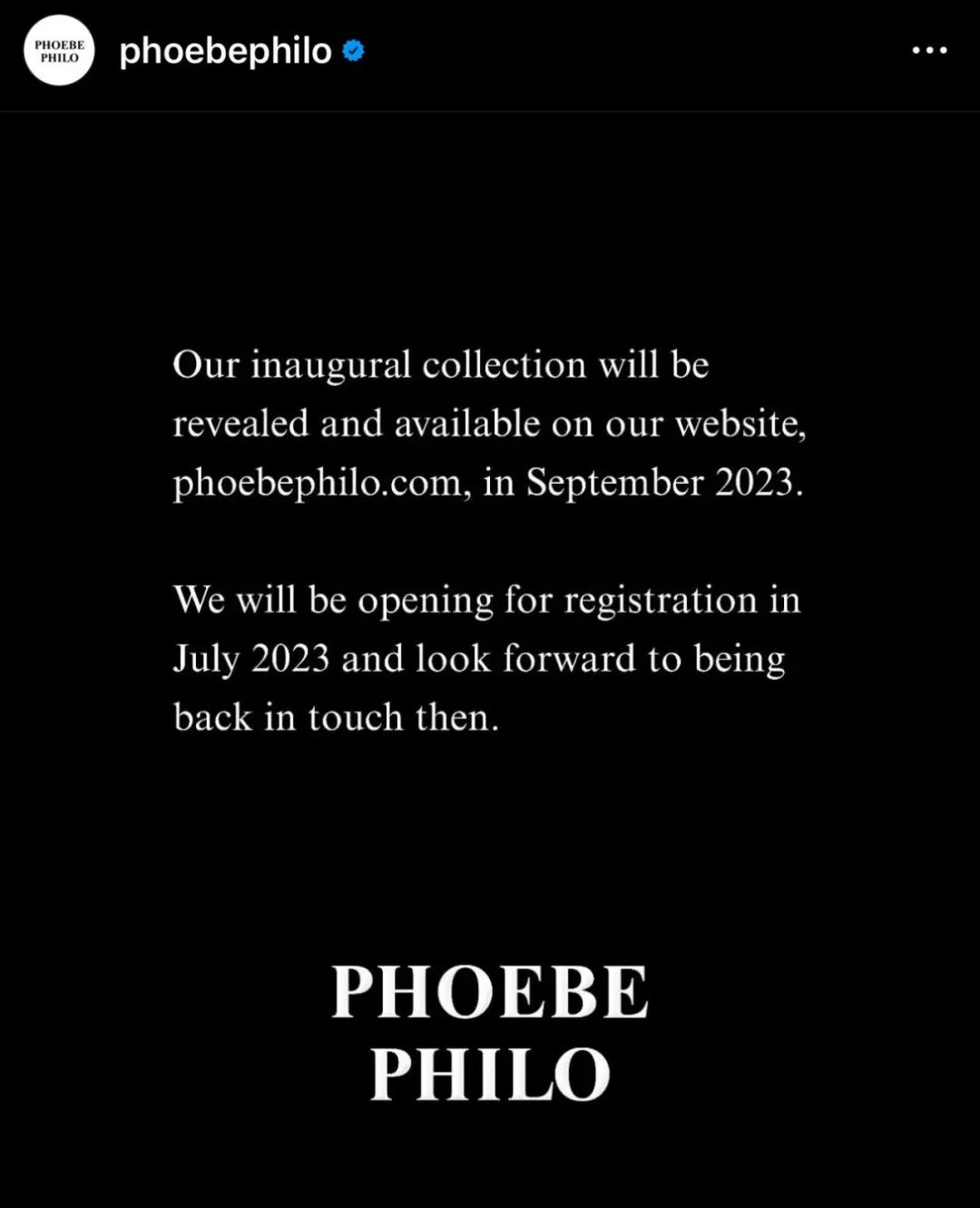 日前,Phoebe Philo开设同名Instagram账号,已获得官方认证,并发布第一条贴文,宣布其个人品牌将于2023年9月正式上线,官网最早会于7月开放注册。