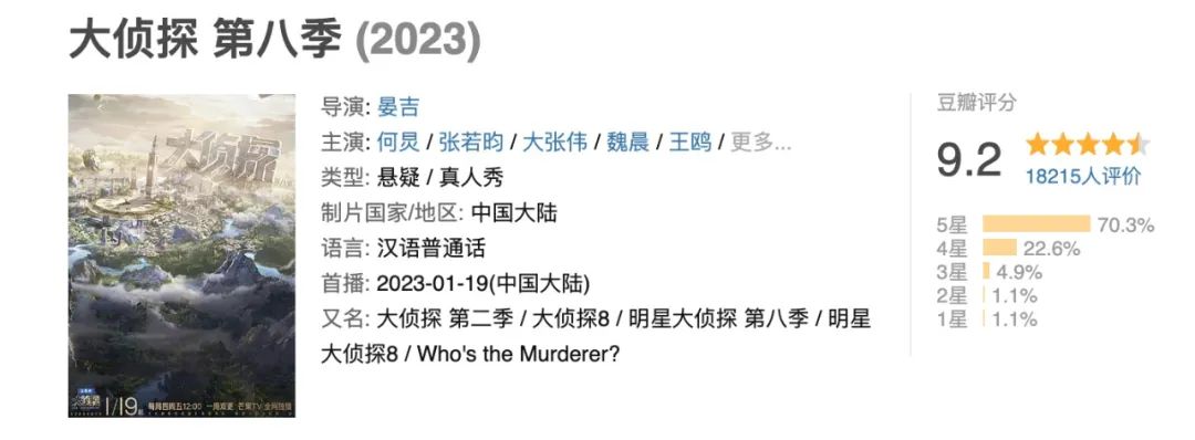 挺过上一季小盒子团队出走引发的动荡后,本季《大侦探8》以9.2的开分迎来口碑上的一个大回升。节目以“熟人局烧脑游戏”的先导片摸准核心受众的喜好,并继续加强案件的场景华丽度和故事反转性,证明了明侦IP仍是推理赛道的天花板。
