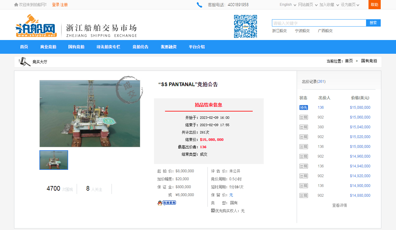 经过多年磨砺,如今“拍船网”国际影响力与日俱增。“SS PANTANAL”钻井平台的竞拍公告一经发布,立即在业界引起轰动。据船舶数字化管理平台“舶赛通”数据显示,该项目受到来自全球37个国家、地区1100多名用户高度关注,超过80%参与拍客户为境外买家。“拍船网”拍卖竞拍记录显示,此次竞拍经历了261轮激烈出价,超45600人次在线围观,最终成交价为1508万美元。