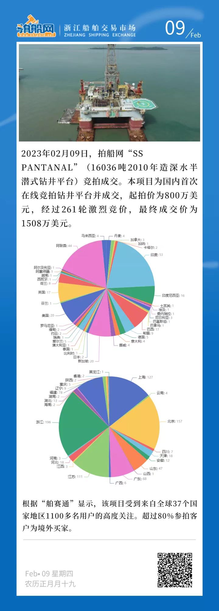素有船舶交易“风向标”之称的“拍船网”再次开创先河。2月9日,浙江船舶交易市场旗下的“拍船网”以1508万美元成功“拍掉”“SS PANTANAL”钻井平台,超过其起拍价800万美元达88.5%。