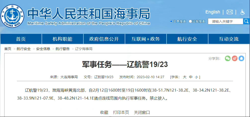 据中国海事局网站消息,大连海事局发布航行警告,2月12日16时至19日16时,渤海海峡黄海北部执行军事任务,相关区域禁止驶入。