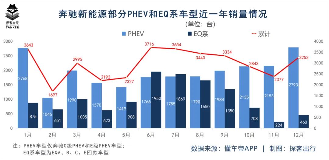 懂车帝数据显示,2022年奔驰PHEV混动车型累计销量约2.32万台,而奔驰纯电EQ系列仅有约1.23万台,六款主流新能源车型累计销量约3.55万台。