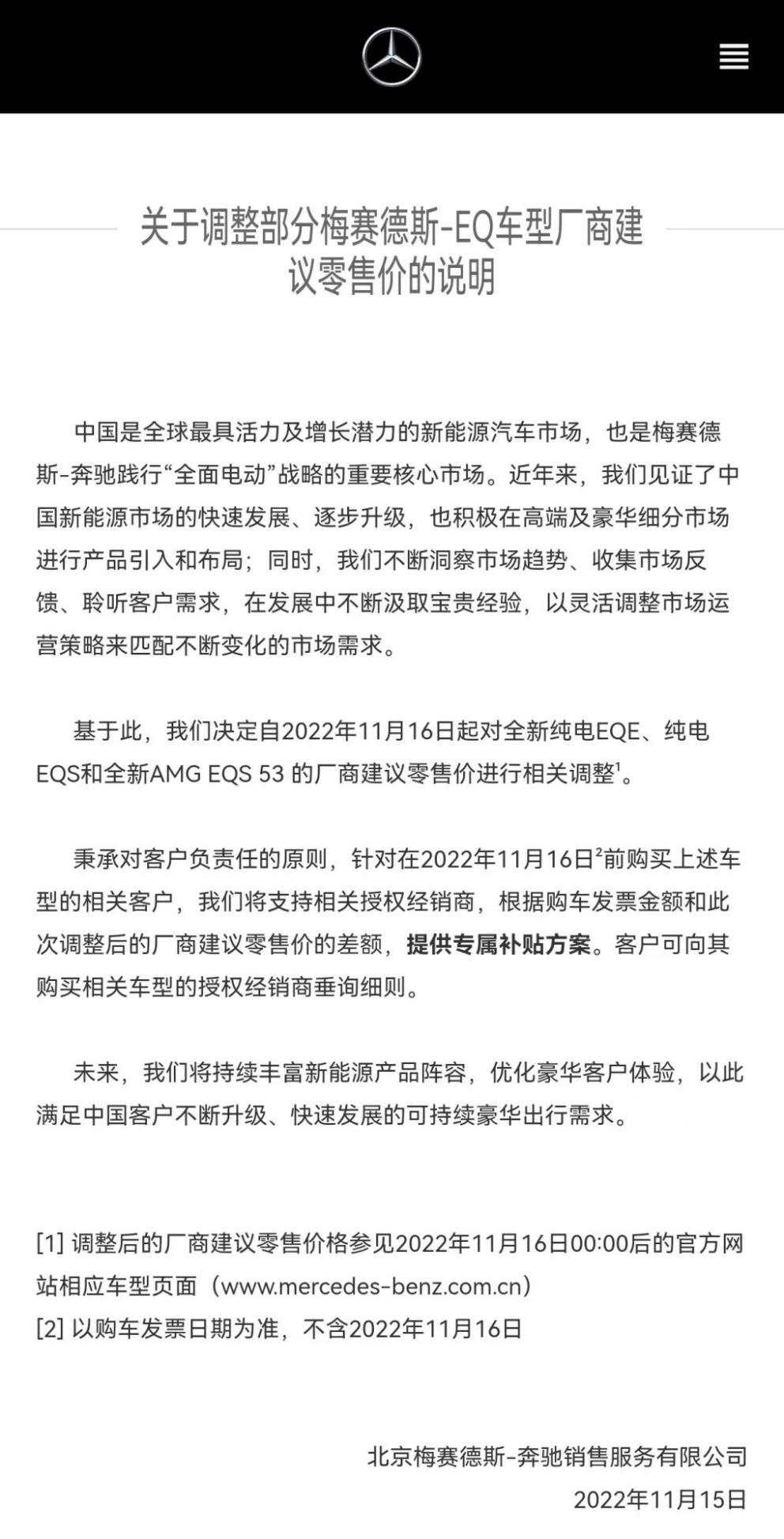 在消费者的不满情绪下,奔驰不得不于2022年11月15日发出《关于调整部分梅赛德斯-EQ车型厂商建议零售价的说明》。