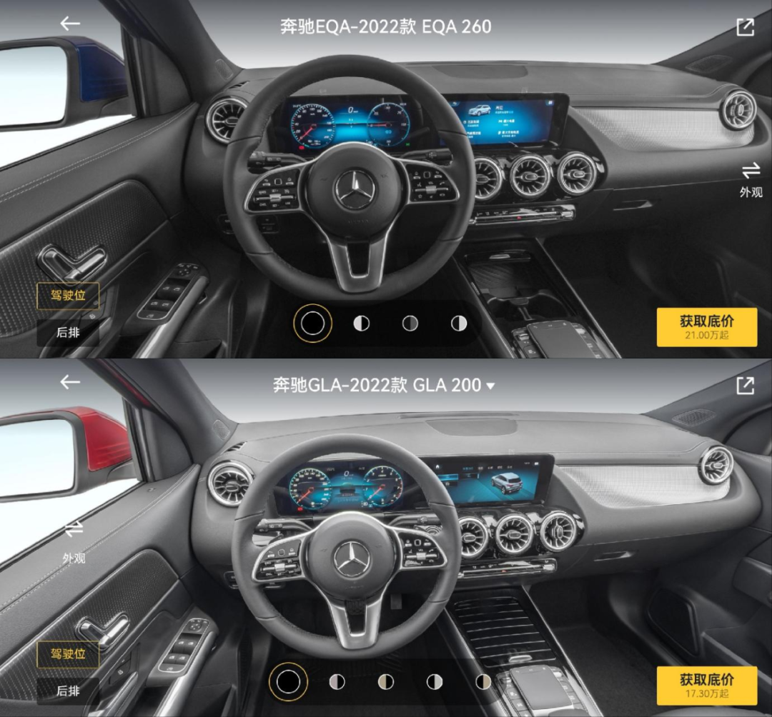 「探客出行」对比奔驰旗下的新能源和燃油车发现,看似独立的EQ系列实则是在GL系列上的一个“油改电”版本。以EQ系列中卖得还不错的EQA为例,与之对应的GLA车型无论是在车身尺寸、空间轴距、底盘悬挂或安全操控,甚至就连内饰装配都几乎一样。