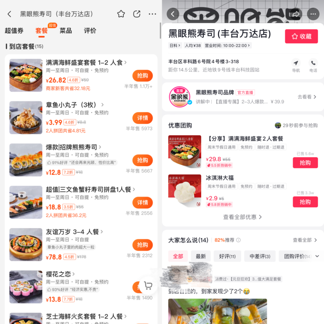 黑眼熊寿司到店订单情况,左为美团,右为抖音