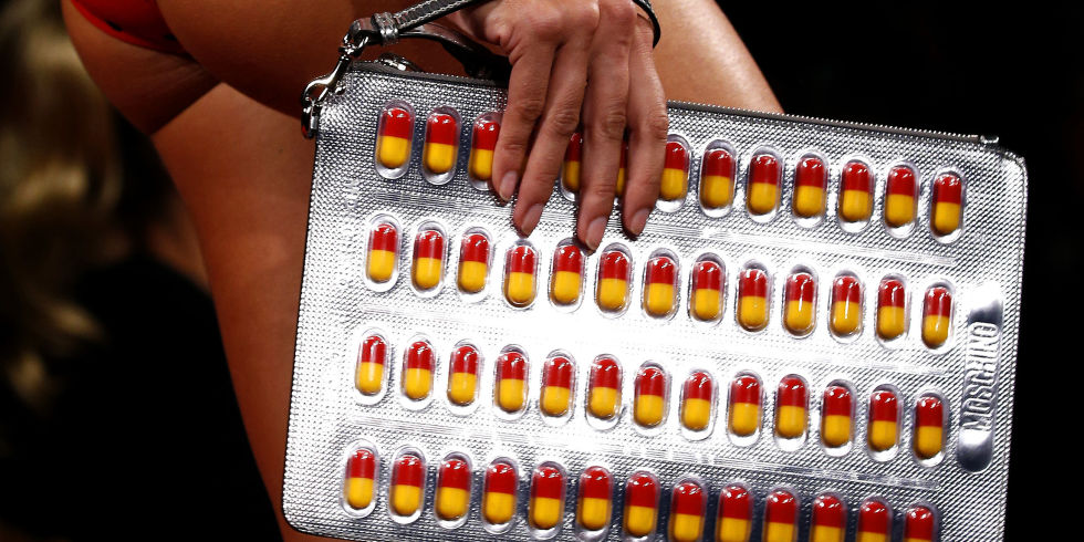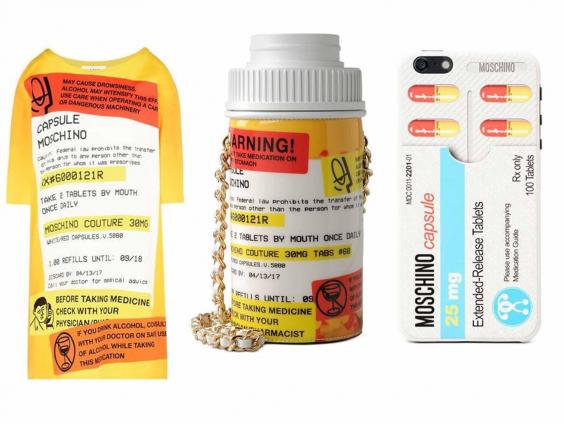 如同之前的麦当劳、清洁剂,烟盒主题一样,贴着“#JustSayNoMoschino”标语、社交媒体标签(这句话引用自“对毒品说不”的公益广告)的药丸系列迅速在社交网络上升温,那些胶囊药板造型的手拿包、贴有处方签的药瓶iPhone手机壳自然又成了爆款。