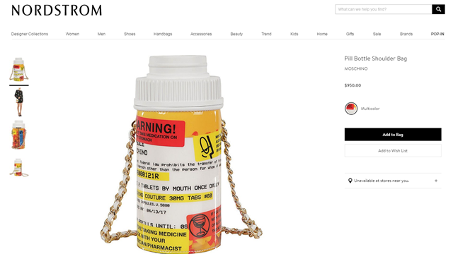不过事实却并非那么简单。9月底,美国全国酗酒和滥用药物委员会的执行理事Howard Weissman亦以和Randy Anderson相同的初衷呼吁Nordstrom下架Moschino的该系列,但对方的声明却和现在大相径庭:“我们无法代表设计师解释这个问题,但时装设计强调的是主观性,所以我们希望通过销售不同风格的产品以满足更多消费者的喜好,很遗憾相关组织对Moschino的该系列有所担忧。”