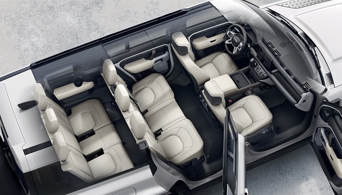 外观方面,新车除了车身加长之外,整体包括外观造型、轴距均与卫士110基本保持一致。340mm的额外加长全部放置于后轴,从而具备2+3+3共计8人的承载能力。空间方面,在第3排座椅直立情况下,后备厢容积达到389升,第3排座椅折叠情况下,后备厢容积可达1232升。