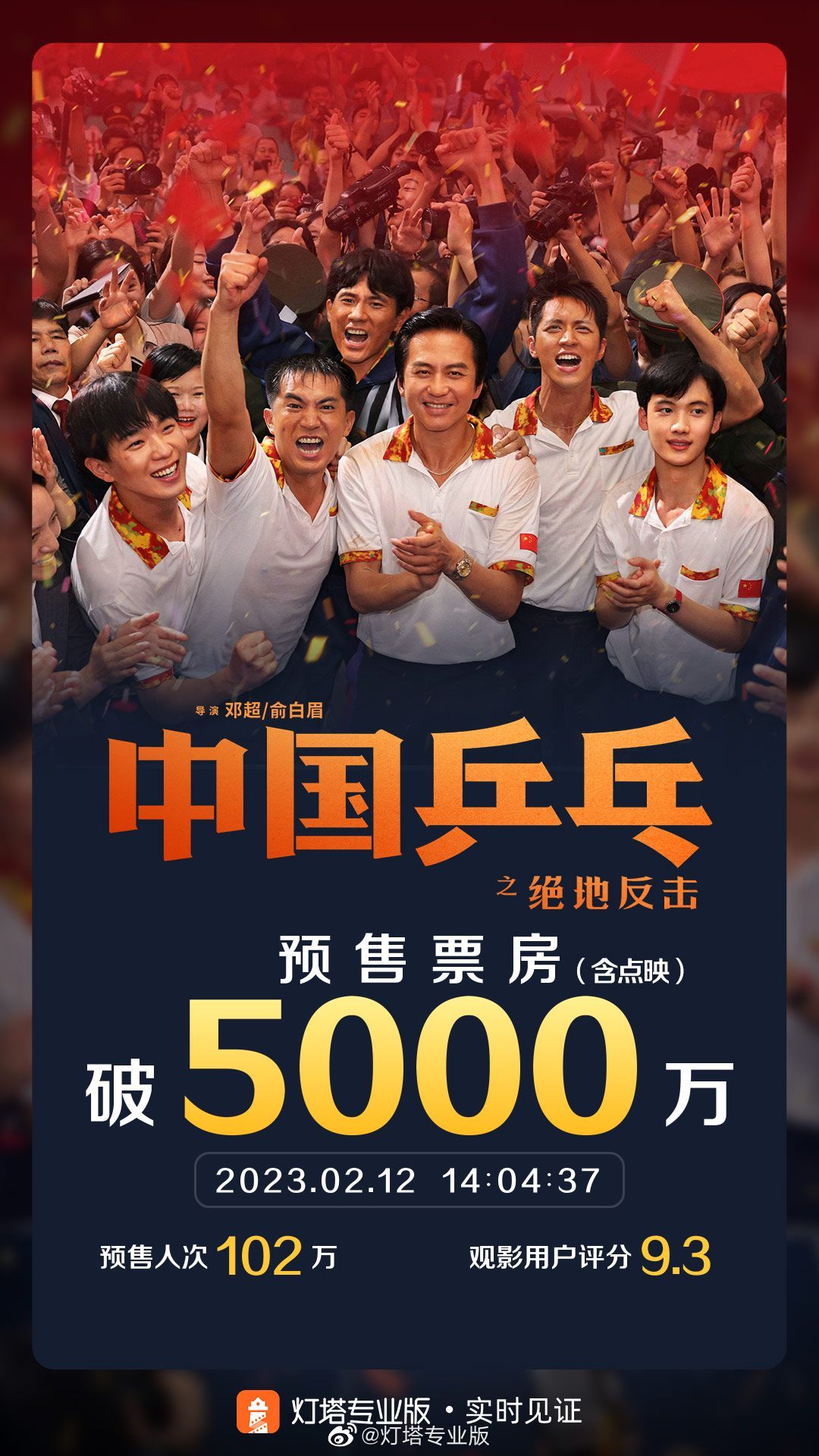 据灯塔专业版数据显示,截至2月12日14时4分,影片《中国乒乓之绝地反击》预售(含点映)总票房突破5000万。