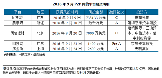 据盈灿咨询不完全统计,2016年9月,P2P网贷行业共发生5例融资事件,融资规模约6亿元,融资轮次较高的平台融资规模也较大。