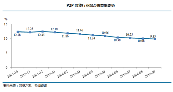 受《网络借贷信息中介机构业务活动管理暂行办法》(下称《暂行办法》)出台等因素的影响,P2P行业综合收益率在9月份跌破10%关口。网贷之家目前9月月报数据显示,当月P2P网贷行业综合收益率为9.83%,环比下降了25个基点(1个基点=0.01%),同比下降了280个基点。