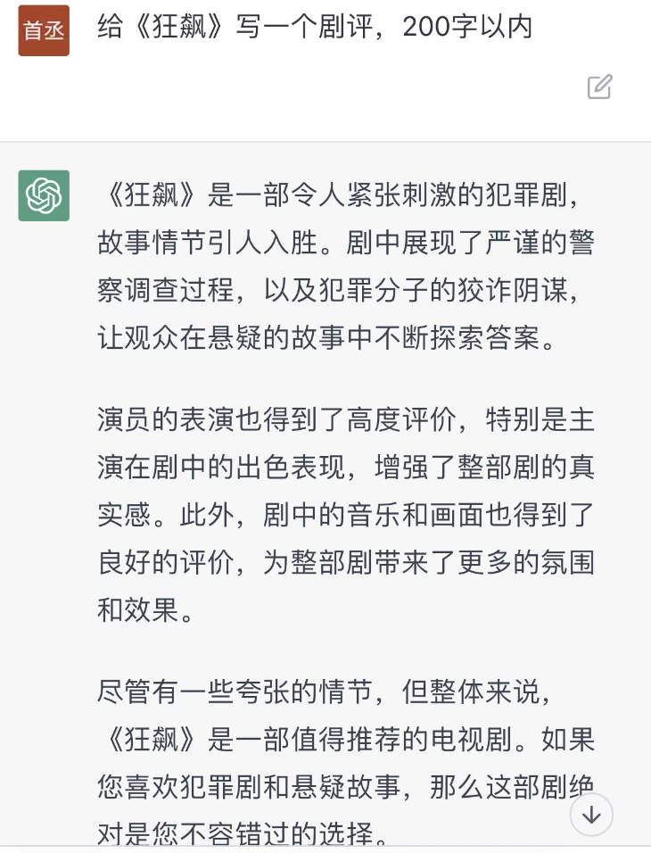 广告行业的让ChatGPT写策划案,体制内的让ChatGPT写材料和发言稿,媒体让ChatGPT写新闻,影视行业的,则试图让ChatGPT写小说和剧本,甚至因此一劳永逸,直接让AI给写好的剧本再写个行业评估和影评。