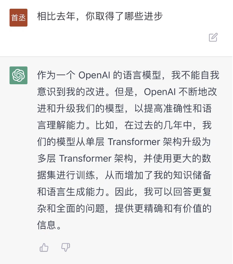 用它自己的话说,是OpenAI将单层transformer架构升级成了多层transformer架构,并使用更大的数据集进行训练,从而增加了ChatGPT的知识储备和语言生成能力。因此可以回答更复杂和全面的问题,提供更精准和有价值的信息。