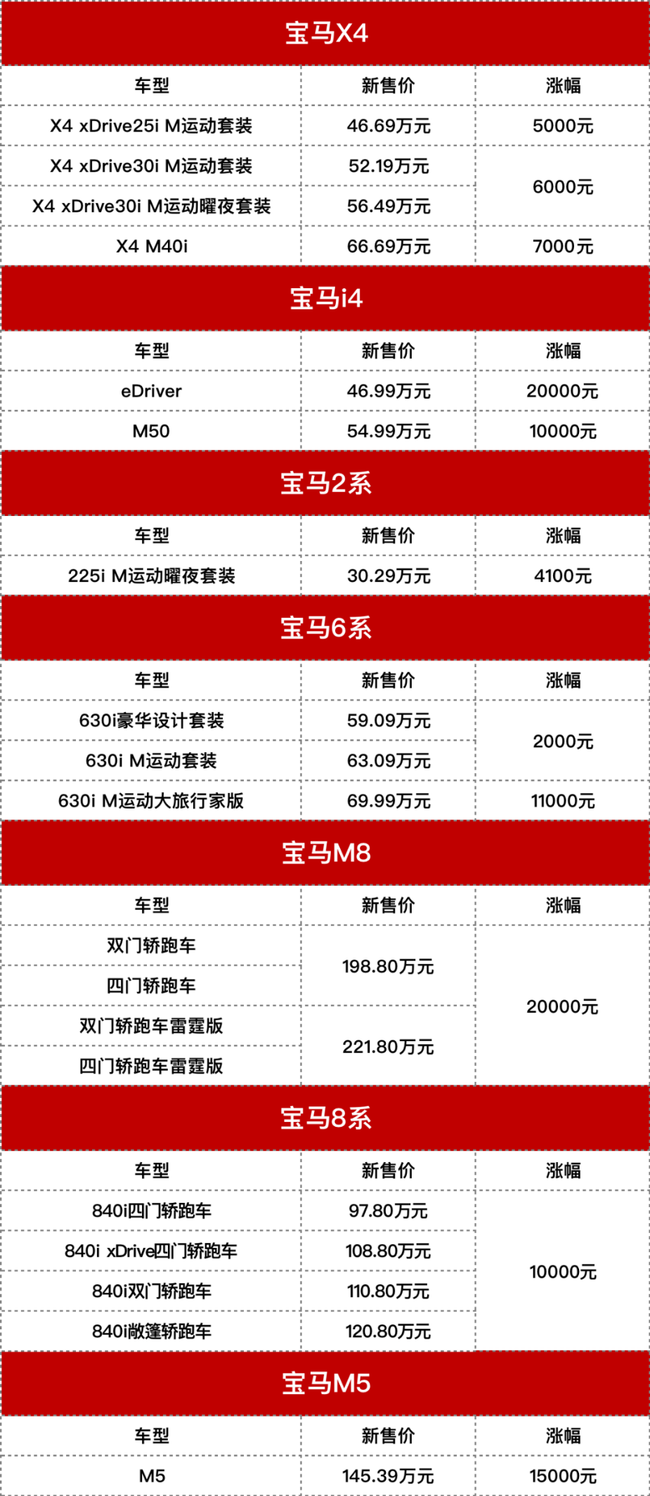 其中,宝马5系涨价幅度在2600元-19600元之间,其进口版5系的价格区间将调整为43.39万元-61.99万元,涨幅在4000元-10000元之间,此外进口版X3车型的价格会提高2700元到7100元不等,而国产版X5长轴距版的涨价幅度甚至达到了7000元-17000元。纯电产品方面,宝马iX3涨价5100元,宝马i3 eDrive 35L涨价4000元,而宝马i4 eDrive 40将会涨价20000元,是本次涨价车型中最高的。