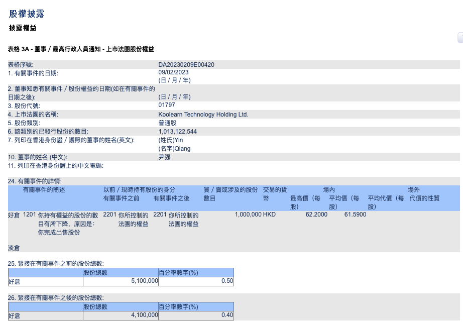 据港交所权益披露资料,2月9日,新东方在线(1797.HK)执行董事兼CFO尹强减持100万股公司股份,涉资6159万港元。减持后,尹强最新持股数目为410万股,持股比例降至0.4%。