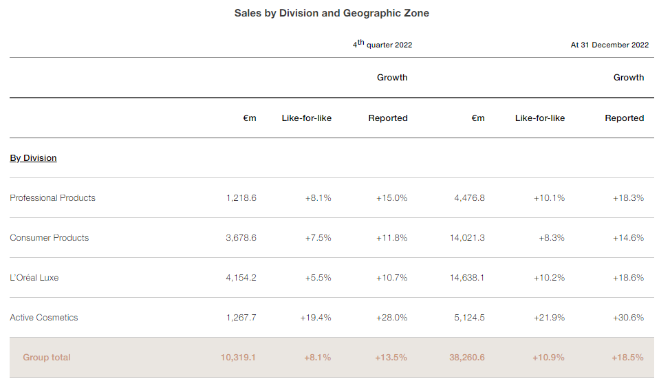 财报显示,2022年,欧莱雅旗下的四大事业部门:高档化妆品部(L'Oréal Luxe)、大众化妆品部(Consumer Products)、活性健康部(Active Cosmetics)、专业美发产品部(Professional Products)均实现了增长。