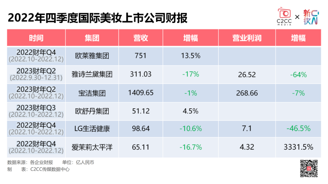 再来看近期各国际美妆巨头发布的2022年四季度财报数据,仅从Q4财报就可以看出,除欧莱雅集团、欧舒丹集团业绩有所增长外,宝洁集团、雅诗兰黛集团、LG生活健康、爱茉莉太平洋等巨头均出现了不同程度的下滑。尤其是雅诗兰黛集团,Q4业绩营收下滑17%,营业利润下滑64%。LG生活健康Q4营业利润也下降了46.5%,近乎腰斩。