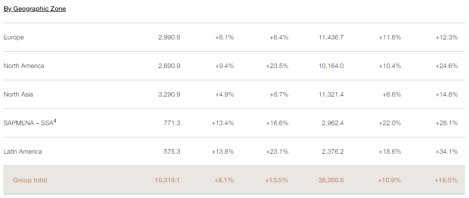 从地理区域来看,在欧莱雅的全球5大区域市场中,欧莱雅也实现了销售额的全线增长。其中,欧洲市场832亿元,增长12.3%;北美市场740亿元,增长24.6%;北亚市场824亿元,增长14.8%;SAPMENA(即:南亚太-中东-北非区)市场216亿元,增长28.1%;拉美市场173亿元,增长34.1%。