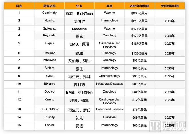 2021年全球销售排名前列药品专利期,数据源于Njarðarson研究小组及公开信息收集整理