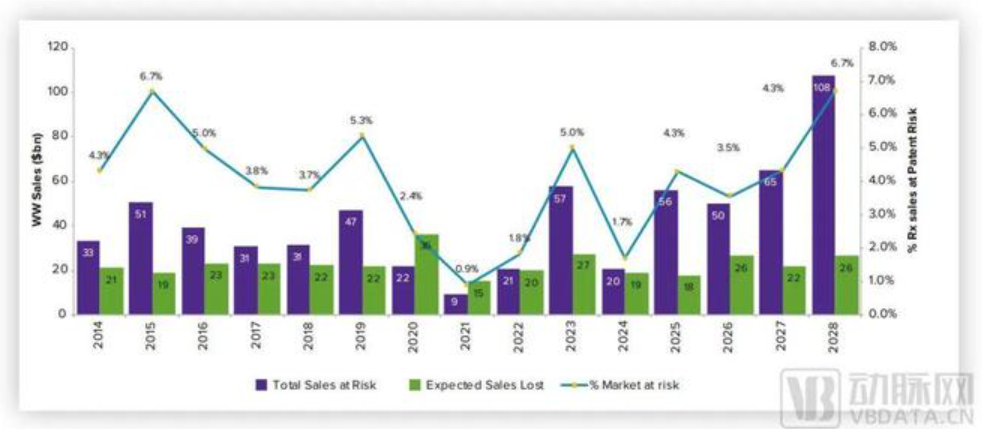 全球销售面临专利到期风险的药物市场规模,数据源于Evaluate Pharma