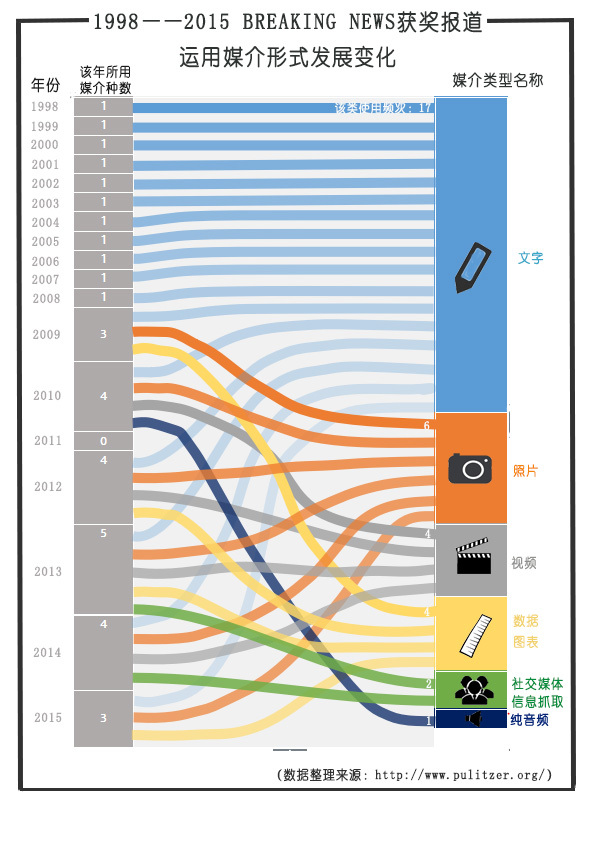 其实,小编对这些年评选出的“普利策”新闻奖作品中Breaking News类别获奖作品的相关情况加以统计分析之后,也得出了如下图所反映的结论:运用多媒体甚至全媒体手段进行报道已经逐渐成为获得世界大奖的新闻作品的必备条件!