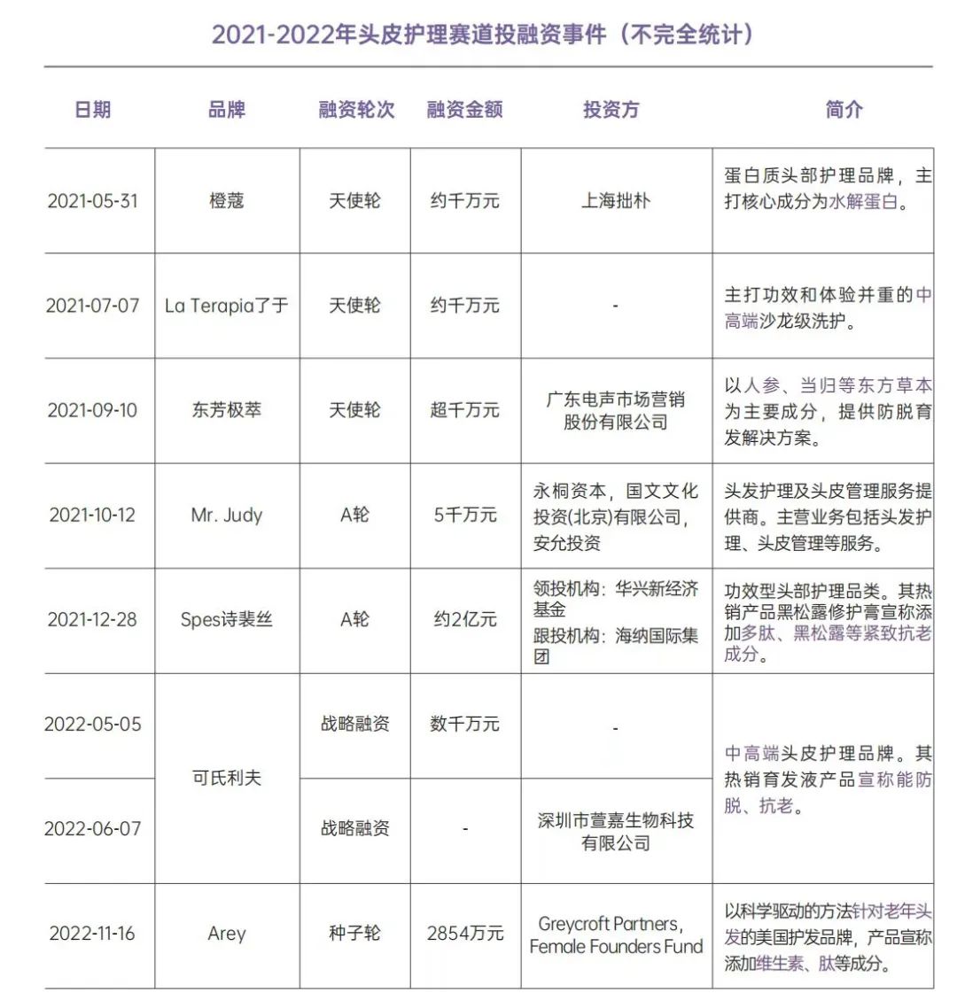 根据《头皮抗衰报告》梳理,近两年已有多个专业头皮护理品牌获投,且多是千万元以上的融资。据不完全统计,从2021年5月至2022年11月,头皮护理赛道投融资事件就有10余件。例如在2022年,中高端头皮护理品牌可氏利夫分别在5月5日、6月7日获得战略融资,融资金额数千万元。同年11月16日,以科学驱动的方法针对老年头发的美国护发品牌Arey获得2854万元融资,其产品宣称添加维生素、肽等成分。